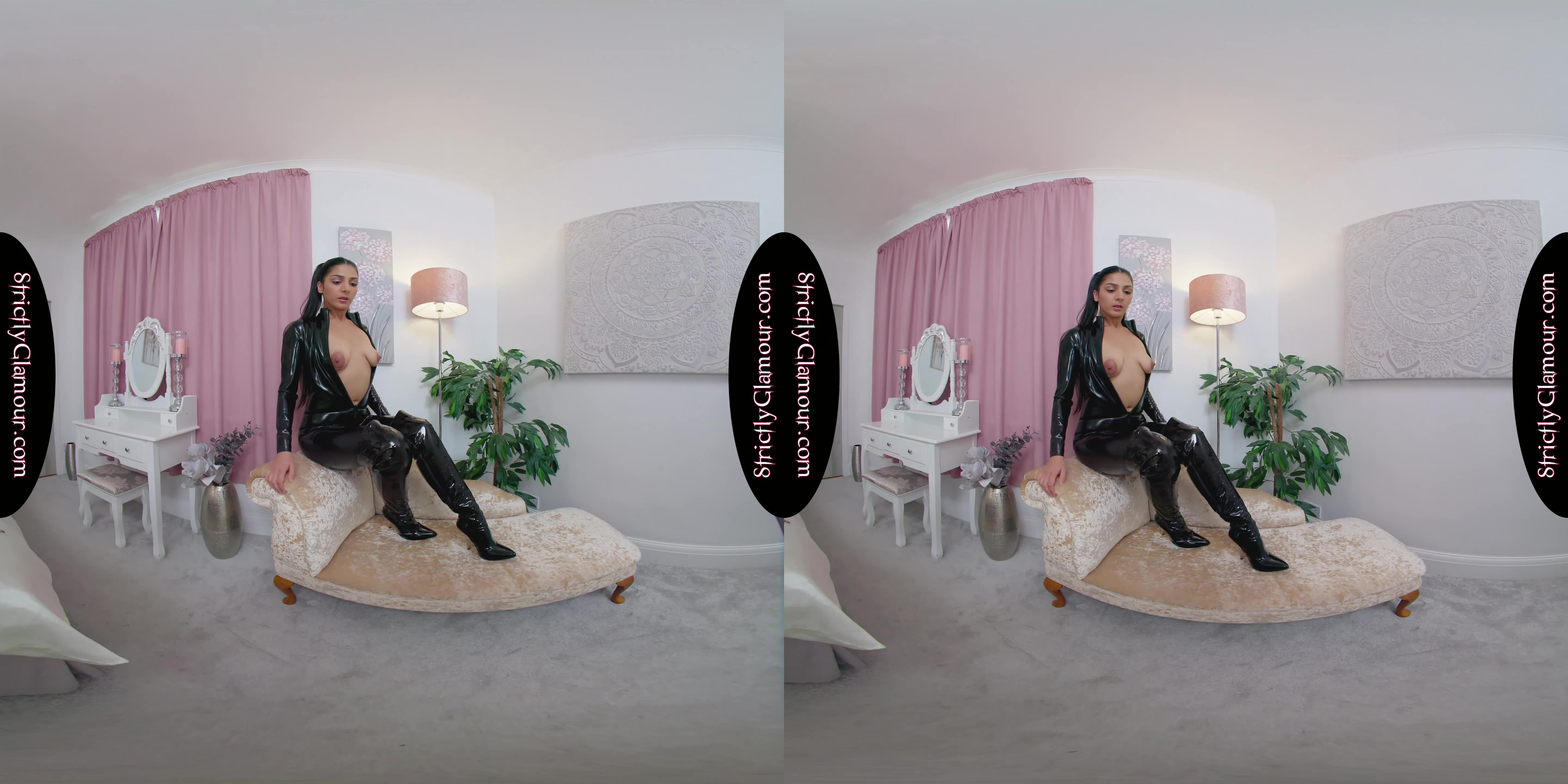 8K 60fps VR Video from shoot with Jasmine wearing a black latex catsuit (sans bra), black stiletto heeled OTK boots, steps forward with flogger whip in hand to entertain and tease in a powerful performance to topless. Listen carefully to what she has to say and enjoy!