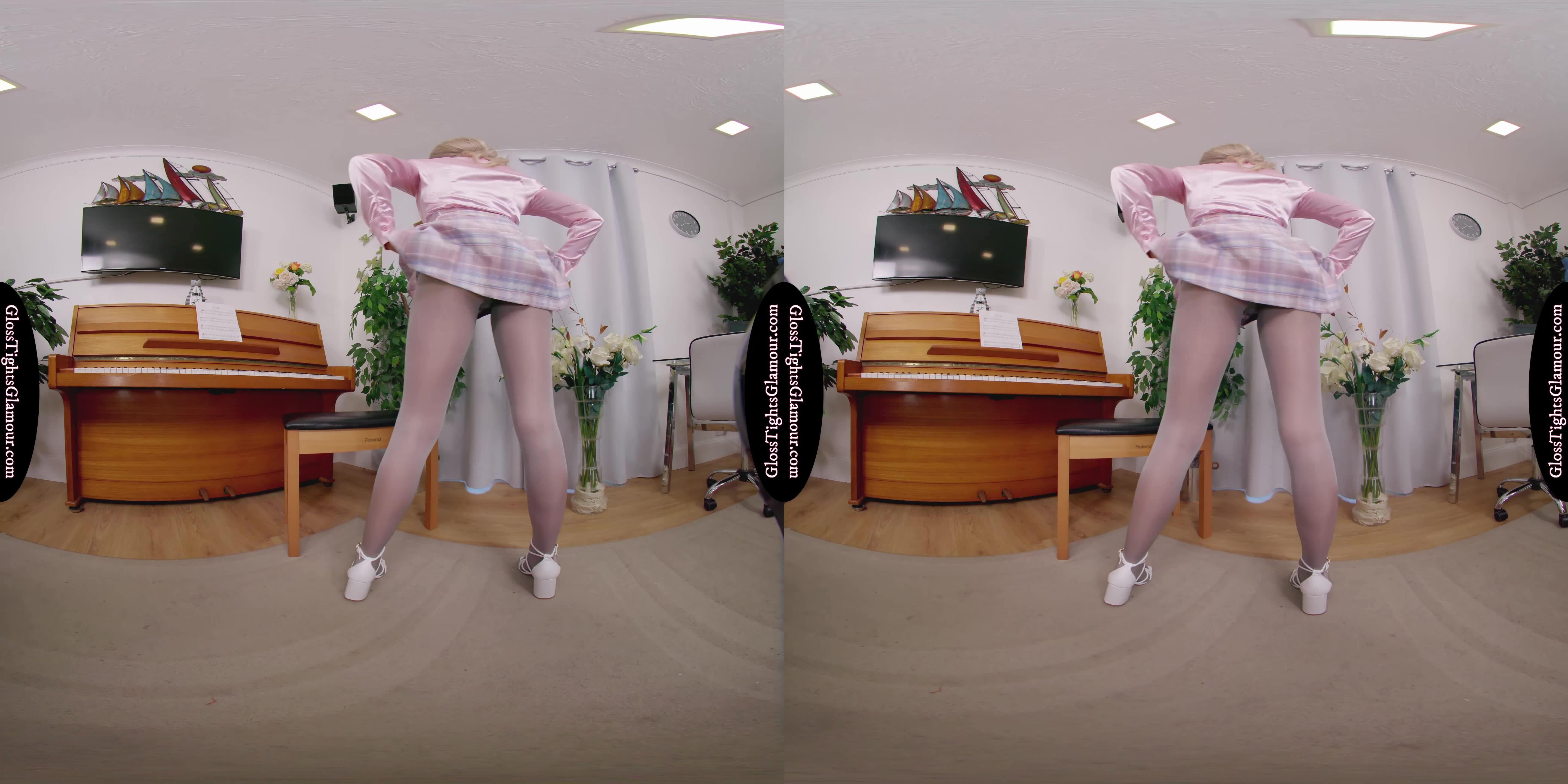 Bethany Morgan is a sight to behold in this 8K VR masterpiece! She's wearing a stunning pink silk blouse, complimented by her patterned skirt, blue matching bra and briefs/panties lingerie set, grey glossy tights/pantyhose, and white block heeled strappy shoes that are removed to show off her toes/feet. As she teases us with a topless performance, you can't help but be mesmerized by her beauty and charm.