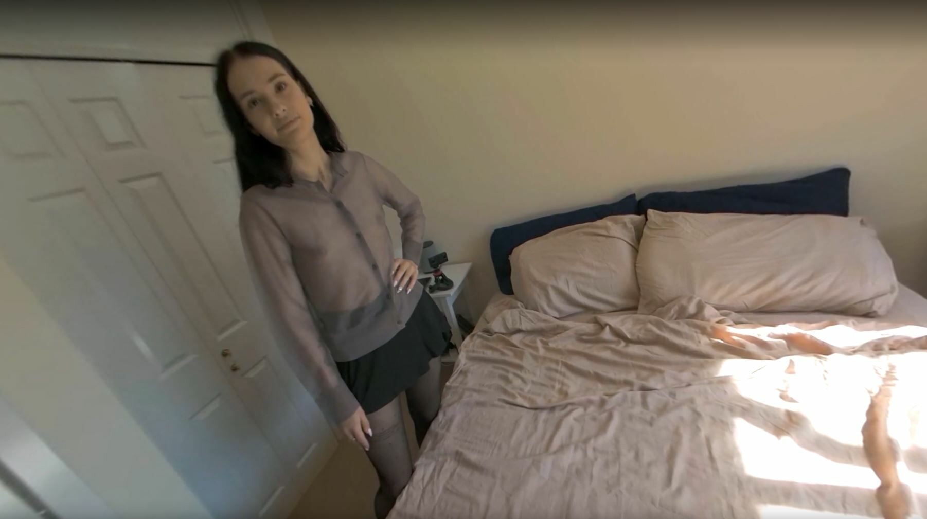 Tokyo mesmerizes in a solo tease, showcasing lace-topped stockings in immersive VR. Feel the seductive allure and intense desire as she captivates with every move.