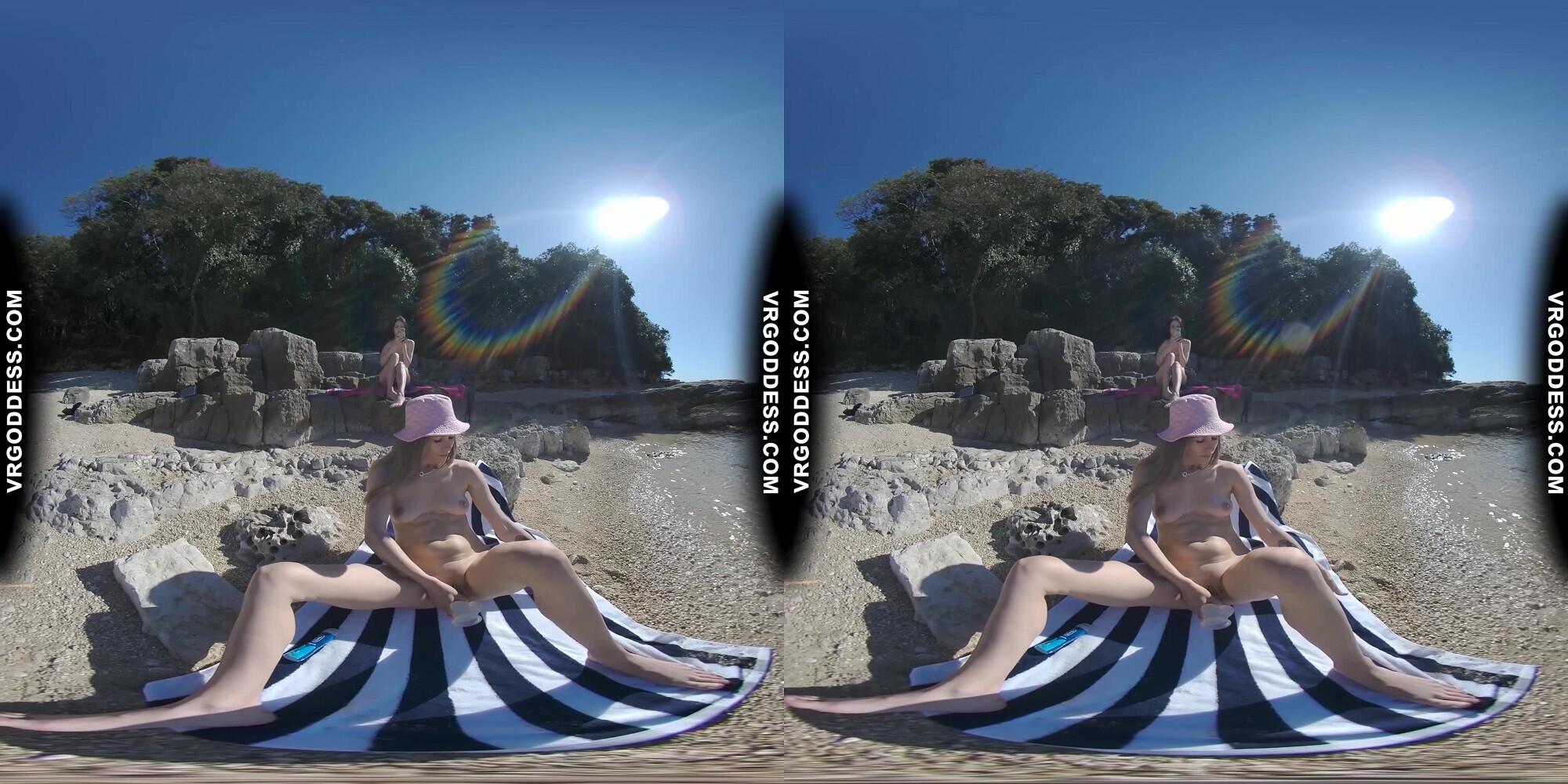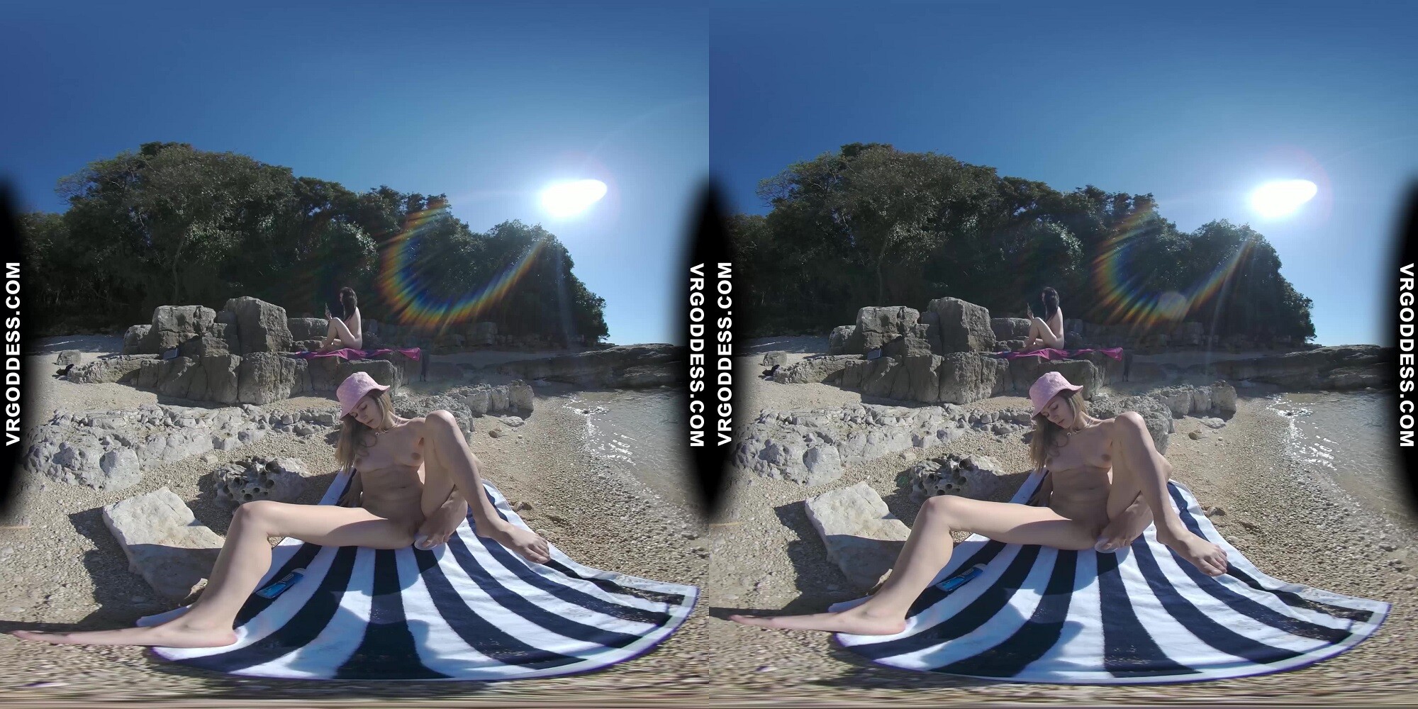 Experience the ultimate beach vacation with Brille & Cherri in this immersive VR video. Enjoy the sun, sand, and stunning visuals as these two gorgeous models take their clothes off and get creative. Watch them spray paint graffiti on a rock wall, strip down to their birthday suits, and show off their natural beauty. This 4K video is shot in 60 Fps and features binaural sound for an incredibly realistic experience.