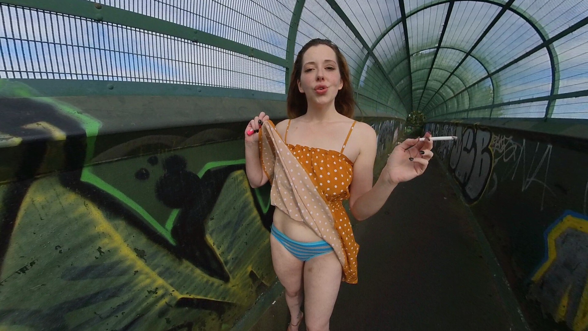 Sneaking around having a smoke with you on the local railway bridge, Aloralux also has a very full bladder, you can imagine whats happens next!
