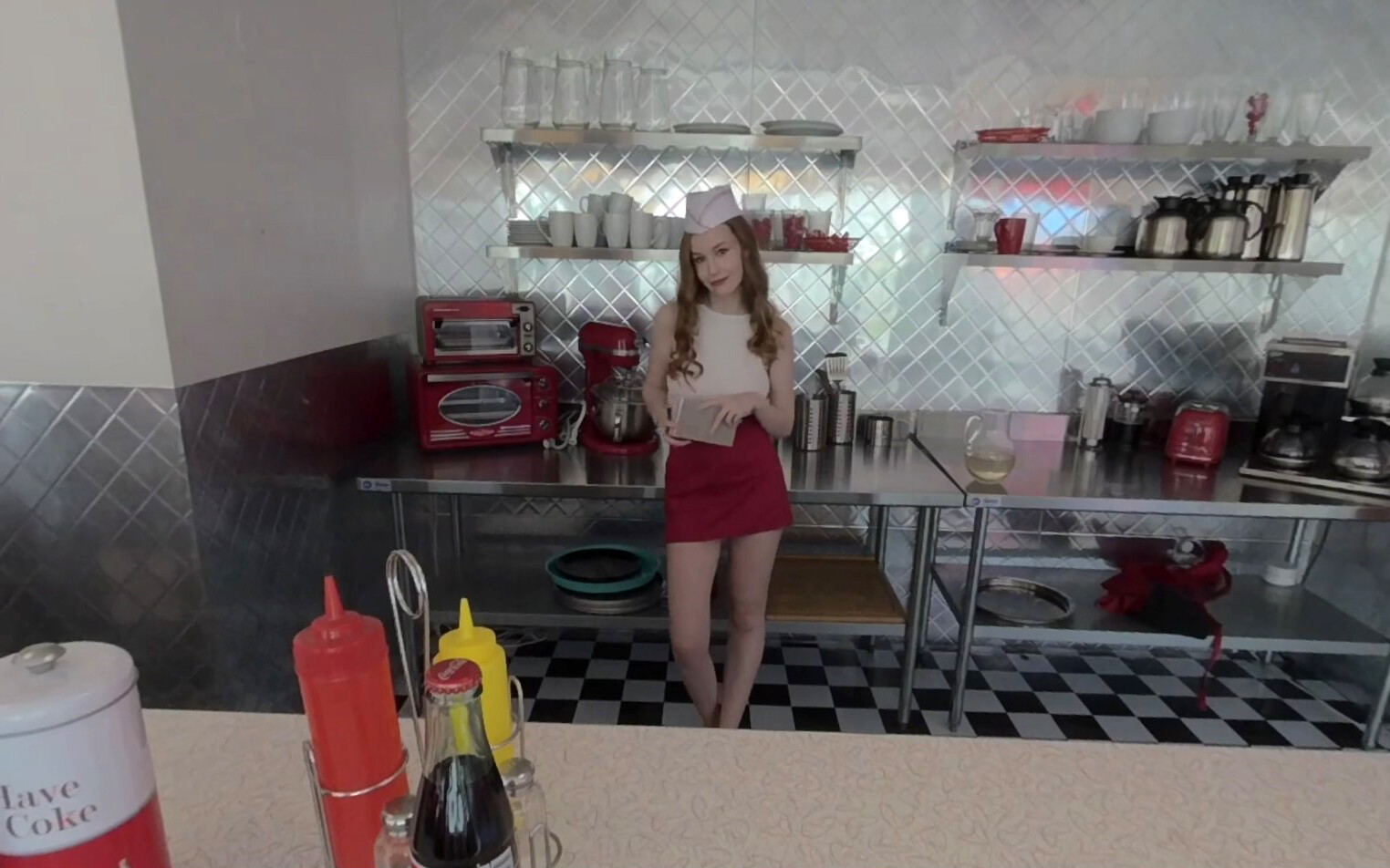 Get ready to be seduced by Emily Bloom in this sultry waitress scene. As you sit back and enjoy the immersive, 180-degree view, she'll tease you with her tantalizing striptease and leave you craving more.
