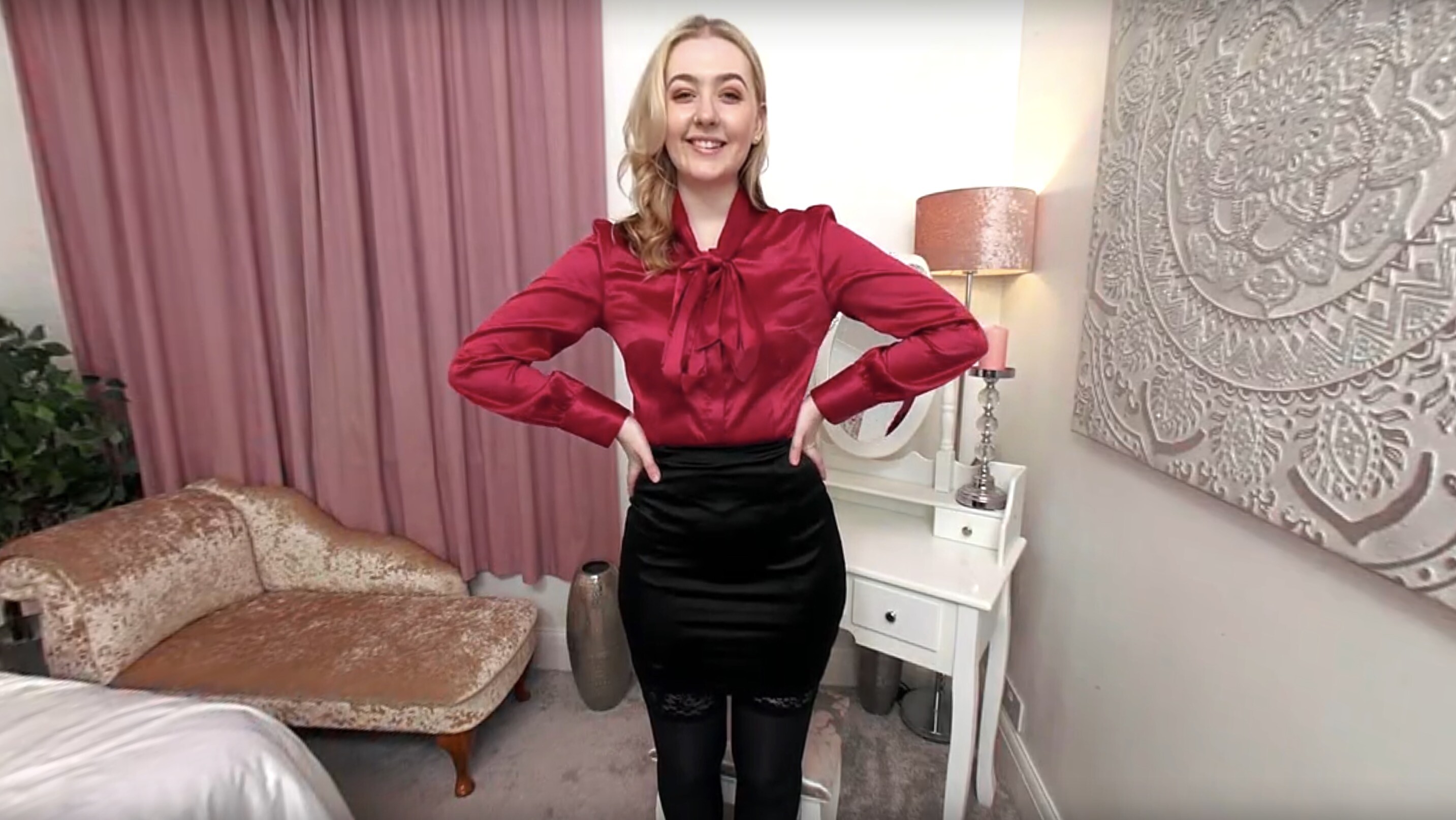 VR Video from shoot with Louisa Lu in her boudoir wearing a pink satin dressing gown/robe & negligee (sans bra), black sheer glossy tights/pantyhose (sans panties), and matching pink high-heeled court...